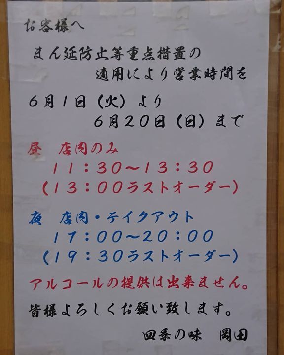 #まん延防止等重点措置 が延長されましたので6月20日(日)までの営業時間はご覧の通りになります。