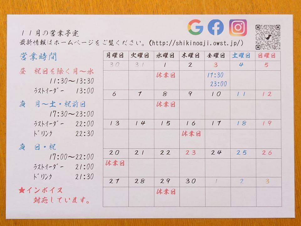 11月08日(水曜)は休業日になります。